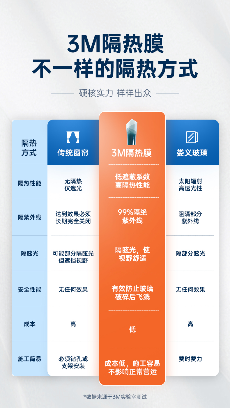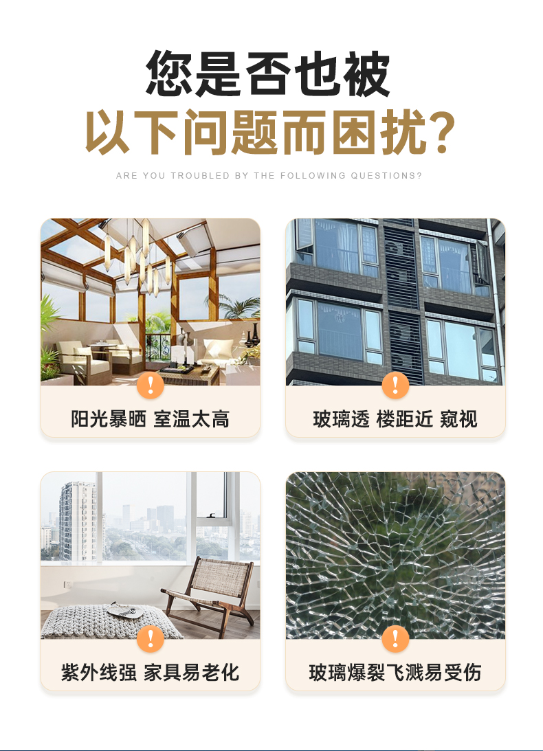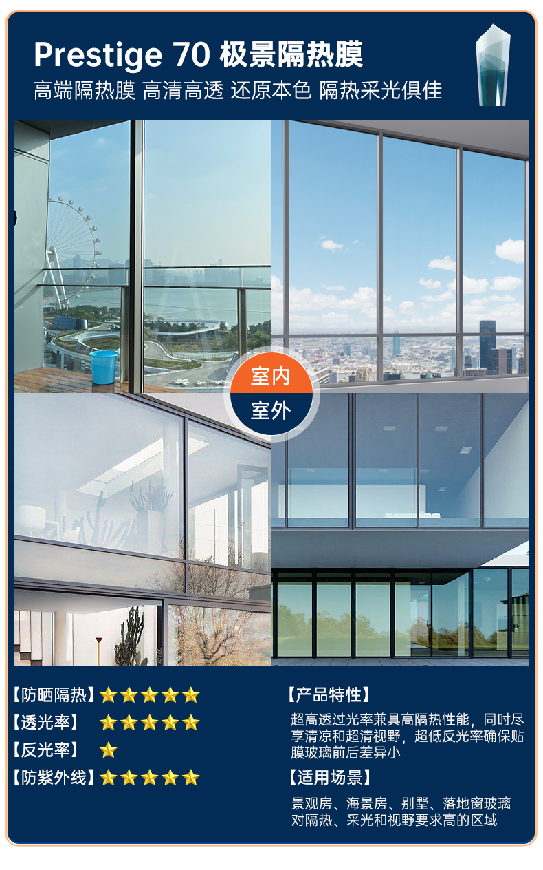 1.夏季減少熱量進(jìn)入室內(nèi);冬天10%保溫率,減少熱量流失2.降低空調(diào)運(yùn)營費(fèi)用3.一年四季保持室內(nèi)冬暖夏涼4.白天具有單向透視效果,提高室內(nèi)的私密度5.99%阻隔紫外線,減緩?fù)噬?,延長家具和織物的使用壽命6.減少眩光和眼睛的不適7.幫助防止玻璃飛濺,增加人身安全