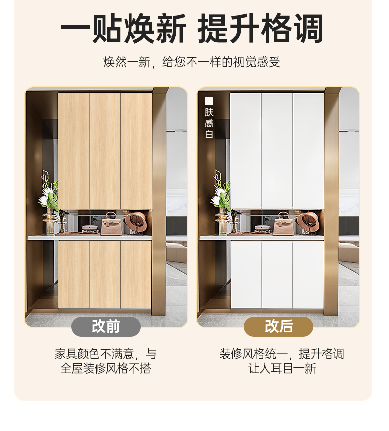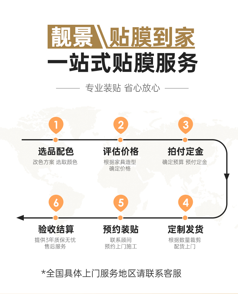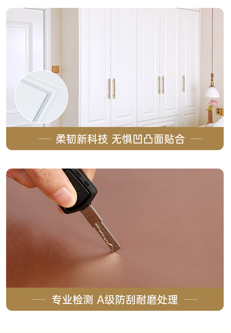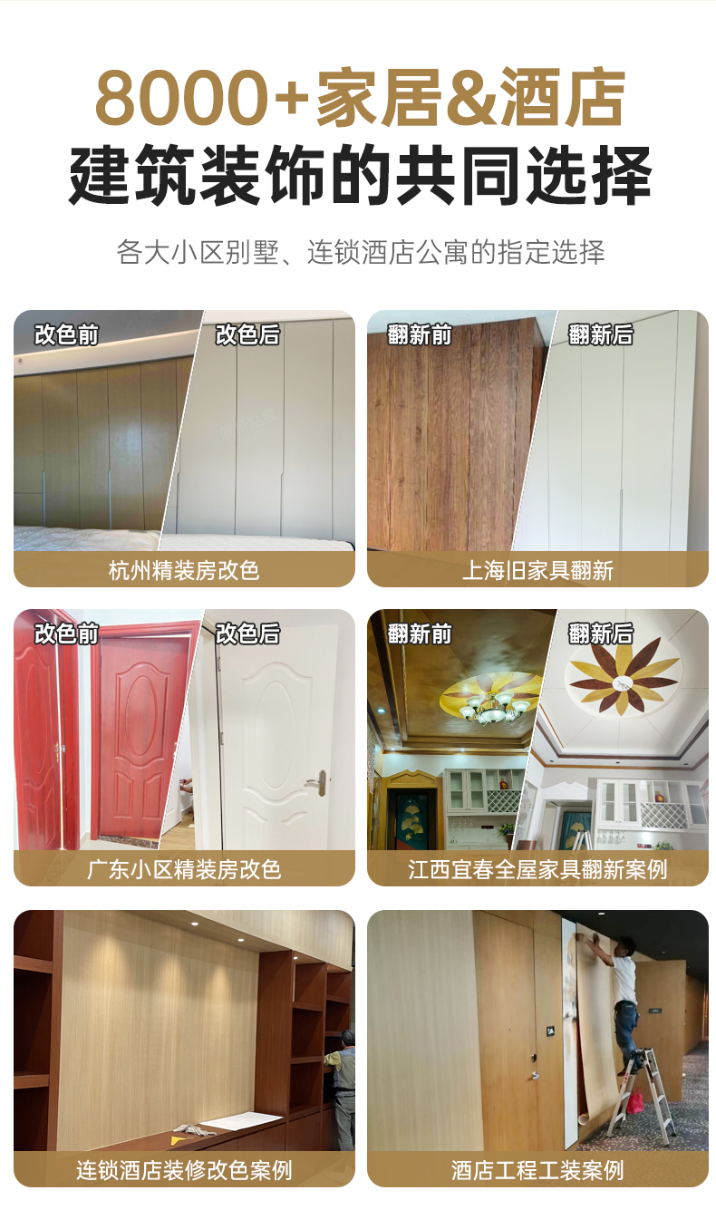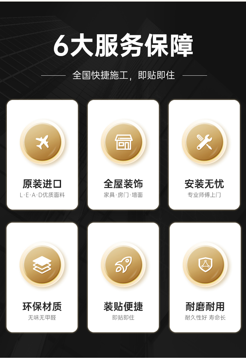 1.原裝進(jìn)口高端材料,安全環(huán)保,質(zhì)感細(xì)膩。2.打破尋常裝飾物料規(guī)范,從機(jī)器線上覆膜到手工線下裝貼。3.全國(guó)2100+城市,專業(yè)師傅上門裝貼。4.300款花色任選,輕松駕馭主流裝修風(fēng)格。5.白天貼,晚上住,沒有噪音,沒有異味。6.不沾指紋,耐磨耐刮,耐久性好,壽命長(zhǎng)。