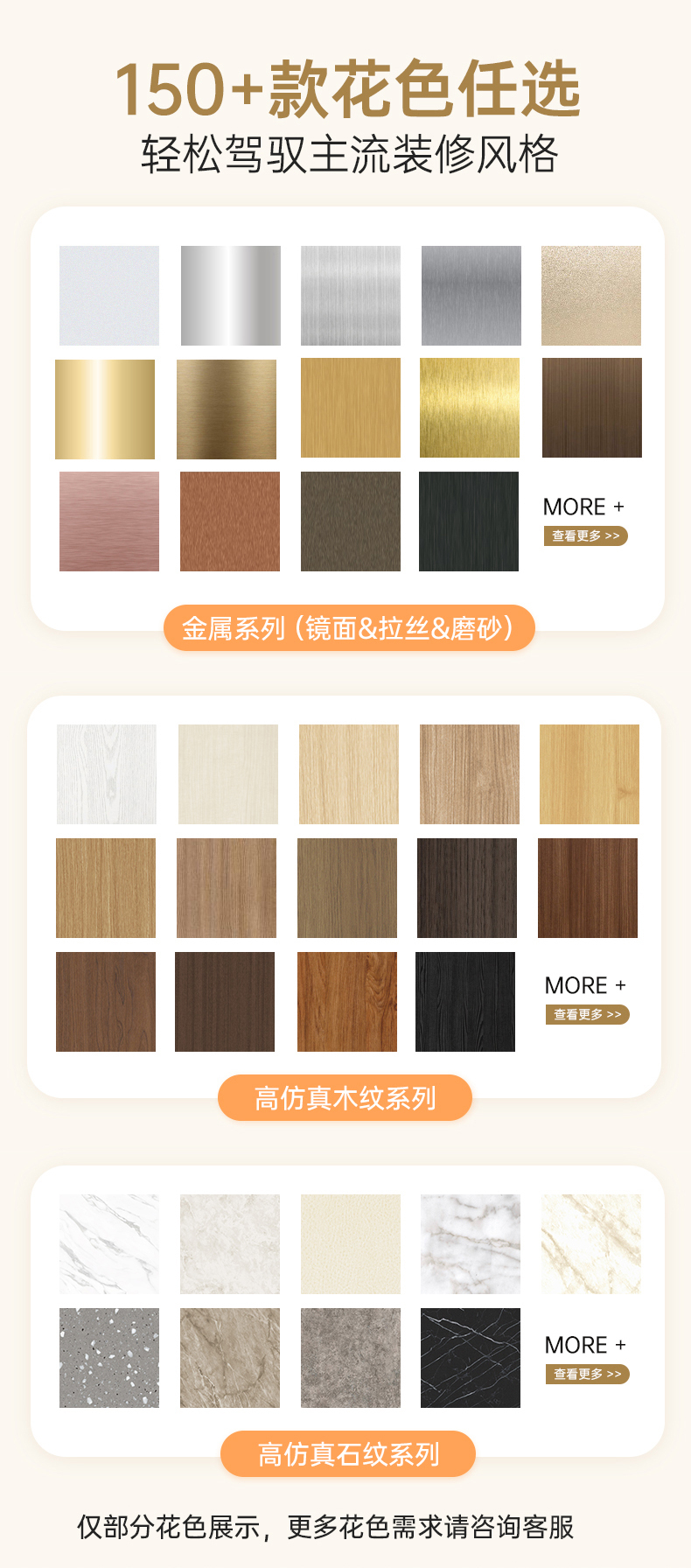 1.高端進口環(huán)保材料,無味無甲醛 。2.全國2100+城市 專業(yè)師傅上門施工。3.方便快捷,沒有噪音,沒有建筑垃圾,不影響營業(yè)。4.金屬質(zhì)感,耐磨耐刮,耐久性好,壽命長。
